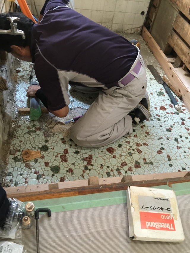屋外で使用されていた洗濯機を室内へ移動~給水排水分岐工事を行いご主人にも手伝っていただきました。