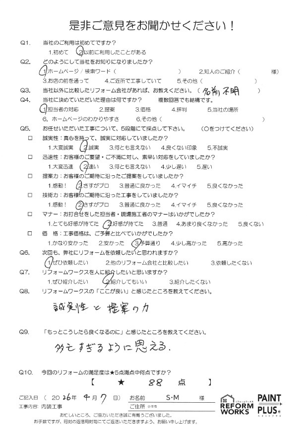 この度は工事をご依頼頂いた上にアンケートのご協力まで頂き誠にありがとうございます。