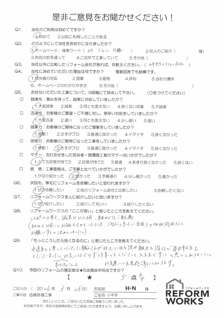 それぞれの工事に来てくださった方も、代表の方も、皆さんなんでも相談ができる雰囲気で、とてもお話がしやすかったです。工事のできあがりも想像以上で非常に満足しています。ありがとうございました。