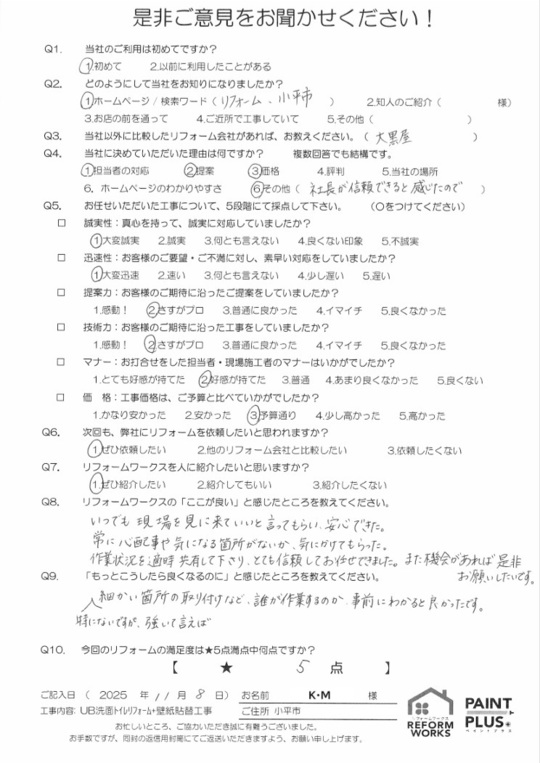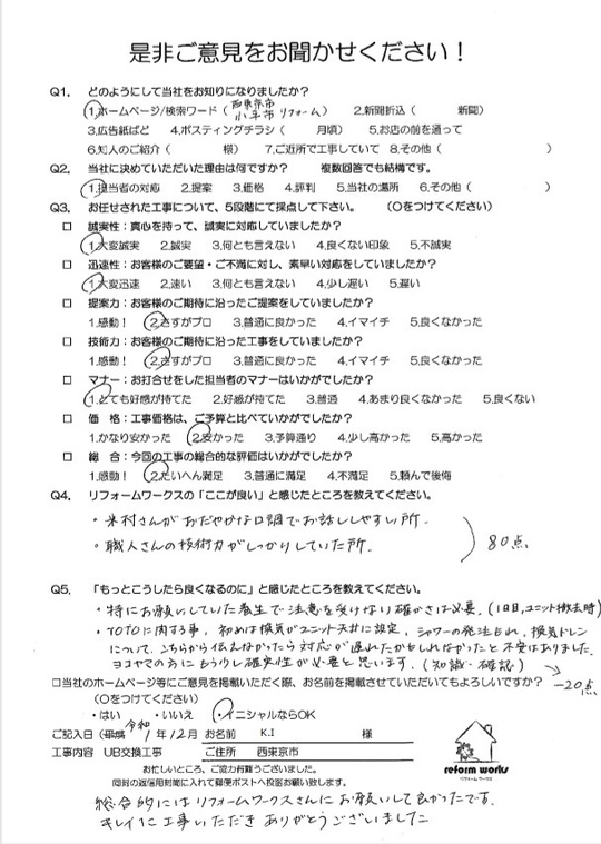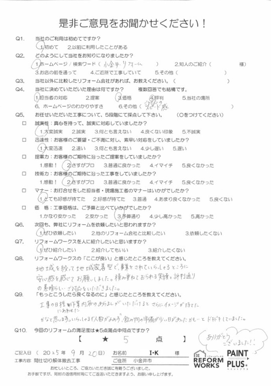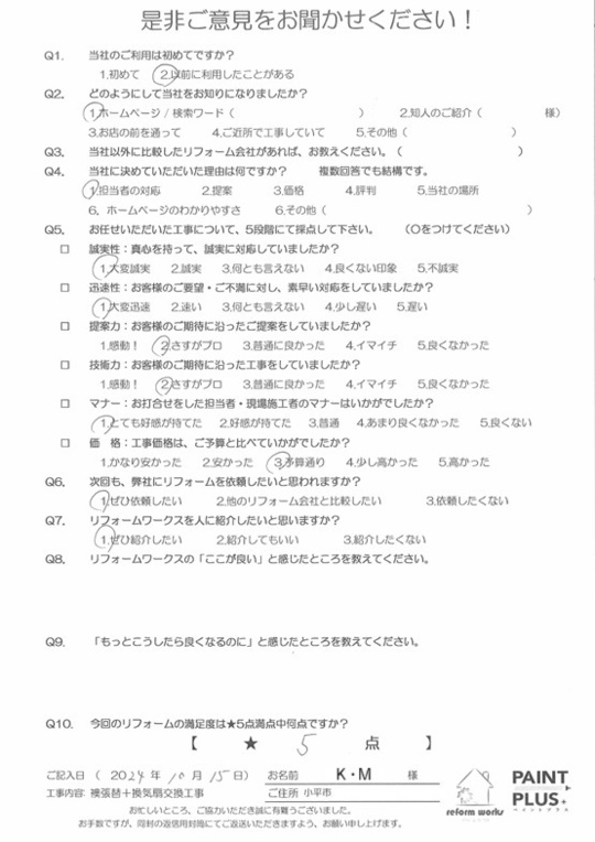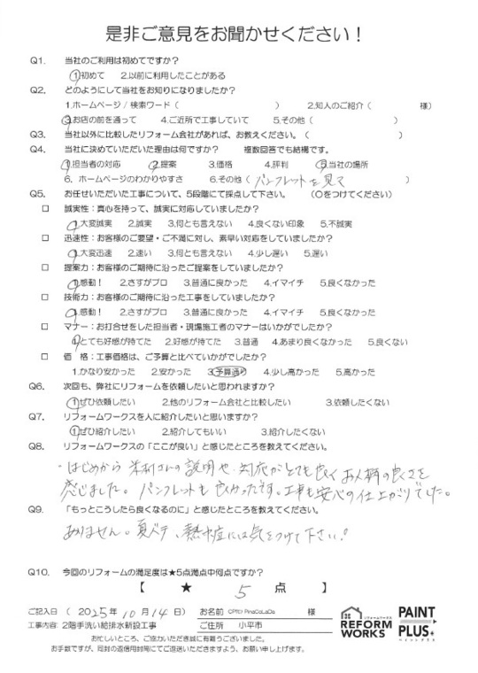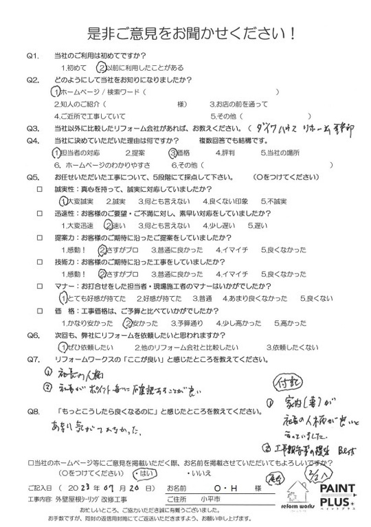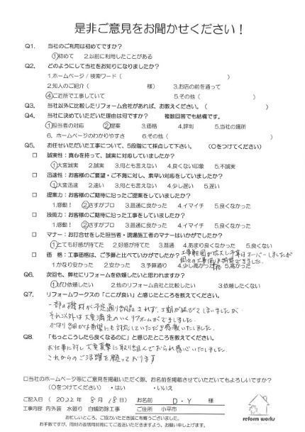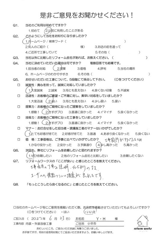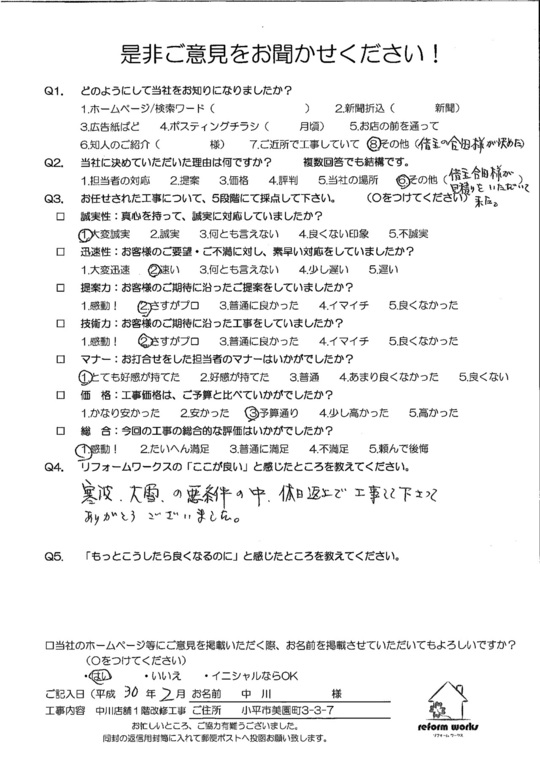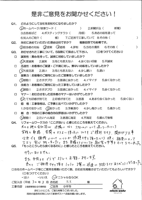この度は工事をご依頼頂いた上にアンケートのご協力まで頂き誠にありがとうございます。
