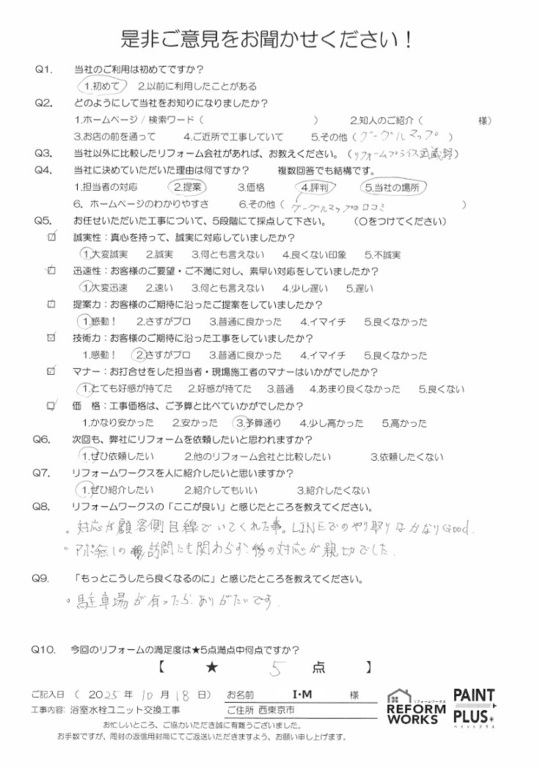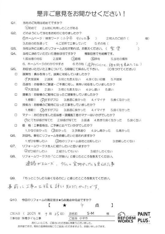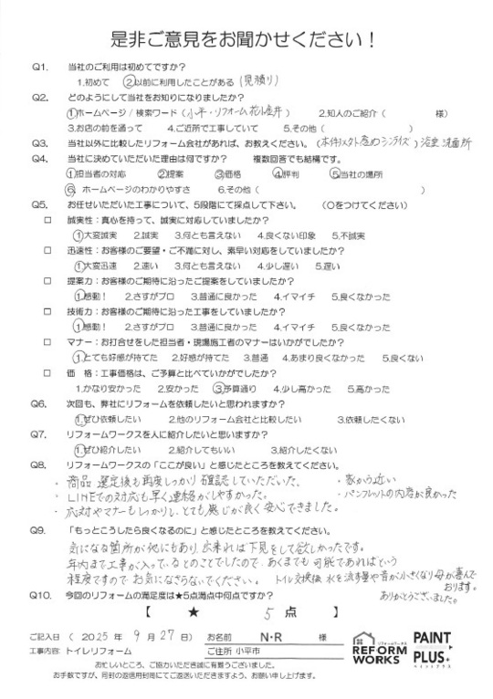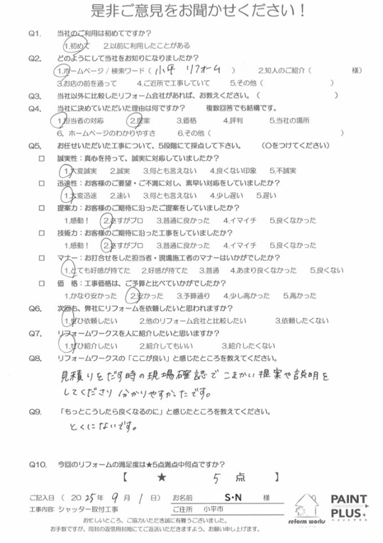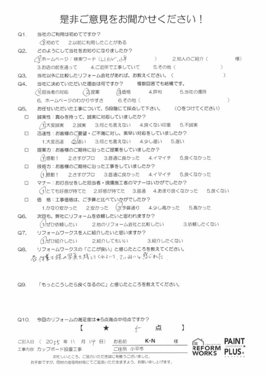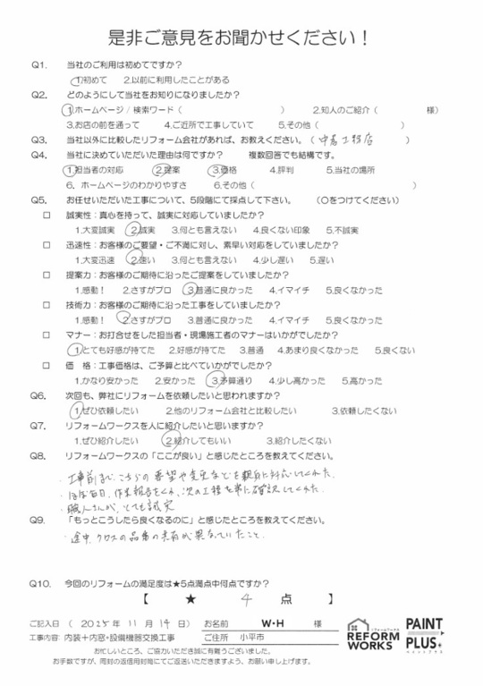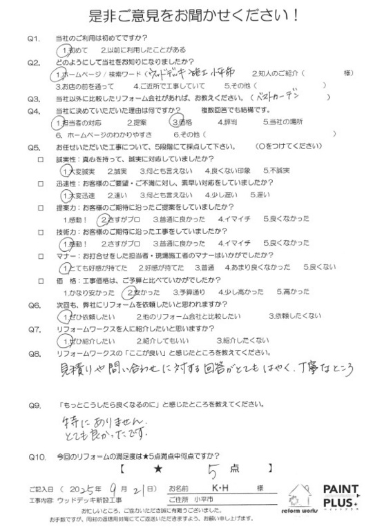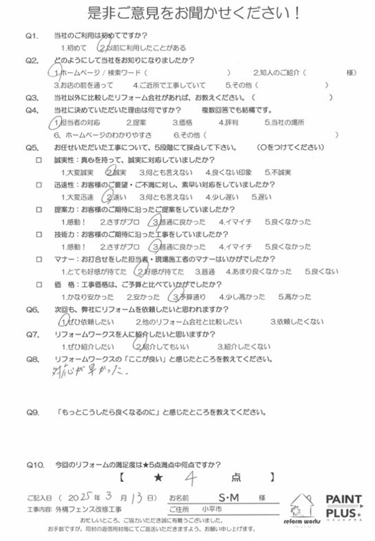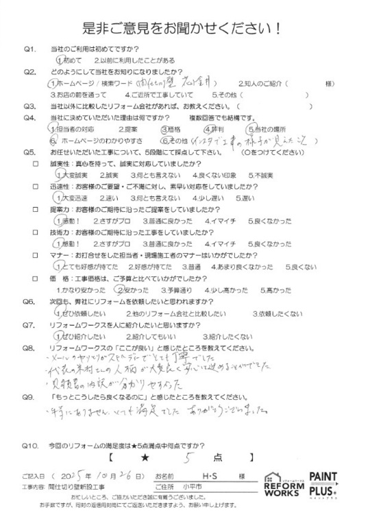 この度は工事をご依頼頂いた上にアンケートのご協力まで頂き誠にありがとうございます。