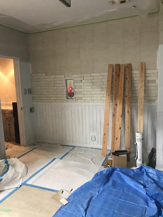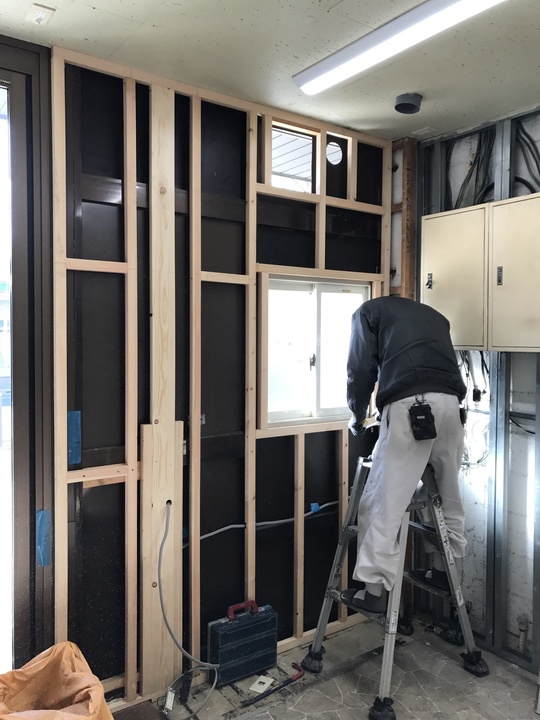 厨房の壁に防火用のケイ酸カルシウム版を貼ります