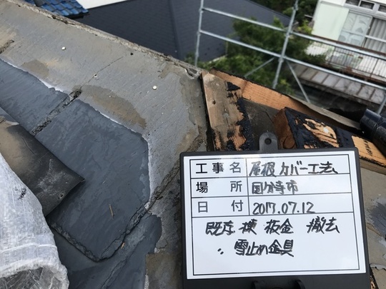 ●足場を組んで既存の棟部、雪止め金具を撤去、防水ルーフィング、本体仕上,,棟板金取付という工程です。
