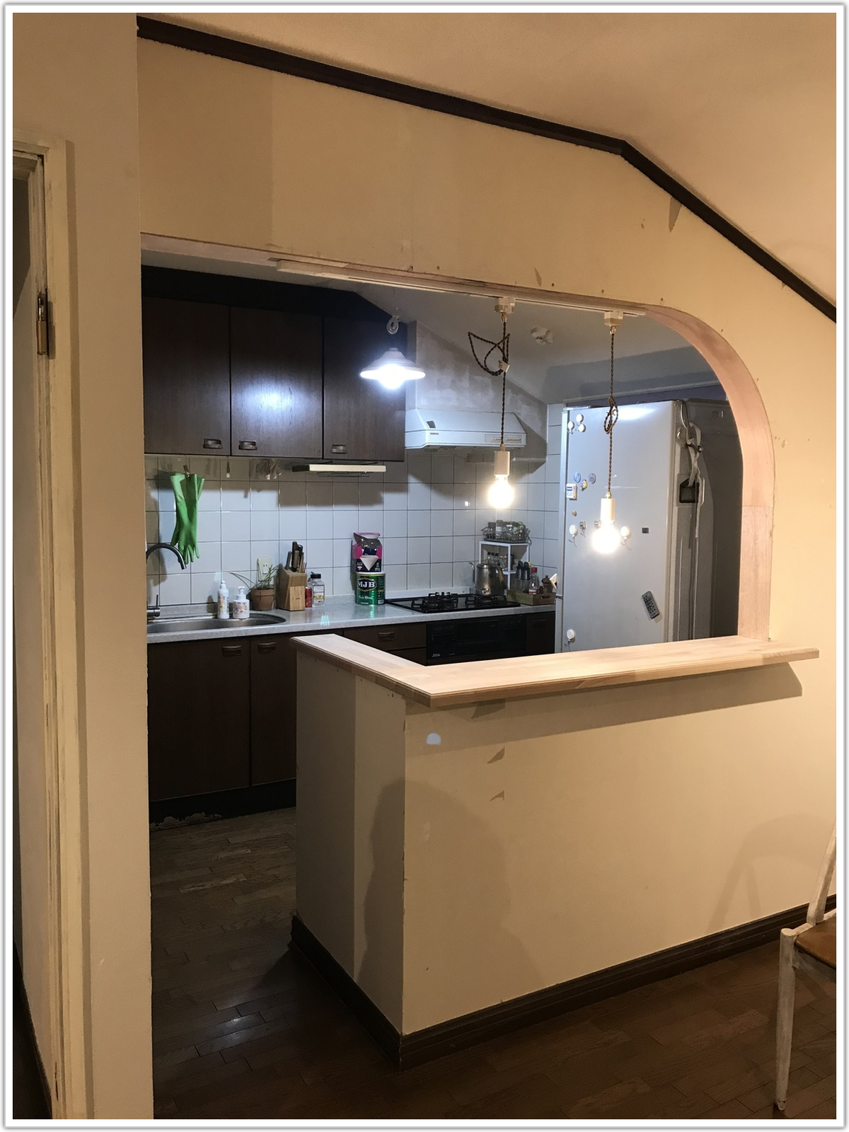 弊社作業は、壁をアーチ型に抜き、カウンターの交換工事を行い完成しました。