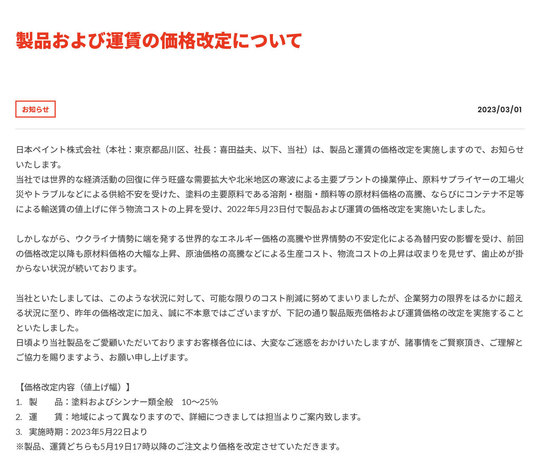 大手塗料メーカー相次いで値上げの発表