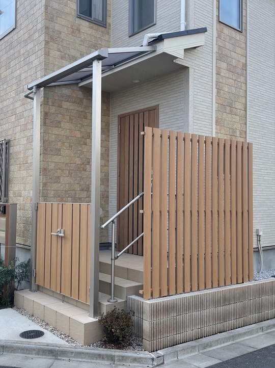 玄関テラスに門扉と手すり、目隠しフェンスの設置をご希望されているのと、既存の庇(ひさし)の長さが少々足りないとのことでした。ご相談の上、庇から延長する形でテラス屋根もあわせて設置させていただくことになりました。