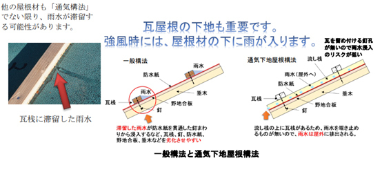 面材の上に 下葺 したぶき 材(防水紙)を葺いた 後、瓦屋根の場合は瓦桟を、その他の屋根は屋根材を直接葺くことが多く、屋根材の下へ雨水 が浸入すると下葺材の上に水溜りが生じやすい納まりとなっています。