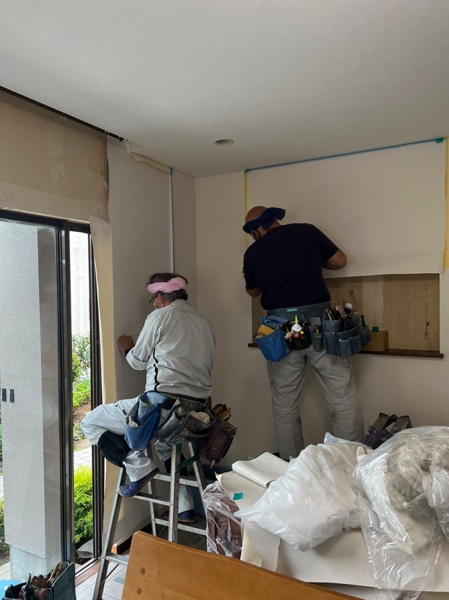 築25年のH様邸。キッチンからリビングにかけて、古くなった壁紙を新しく貼替えました。