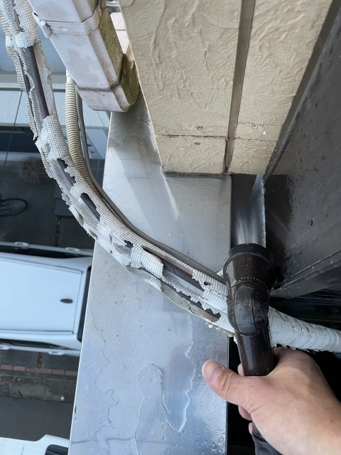 外壁塗装工事のご依頼を頂き、作業を進める中で、玄関ポーチの庇の黒ずみ部分(ビスのサビ)に塗装をしても、すぐに剥がれる状況だったため、雨水が入り込んでいる可能性があるとして調査をすることになりました。