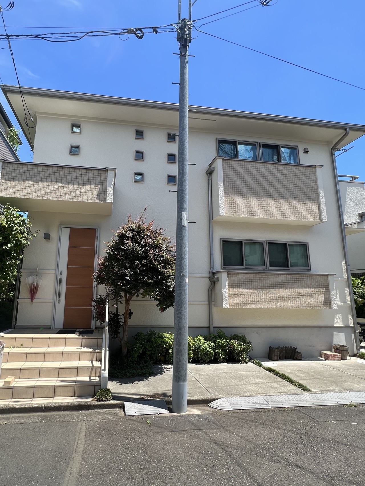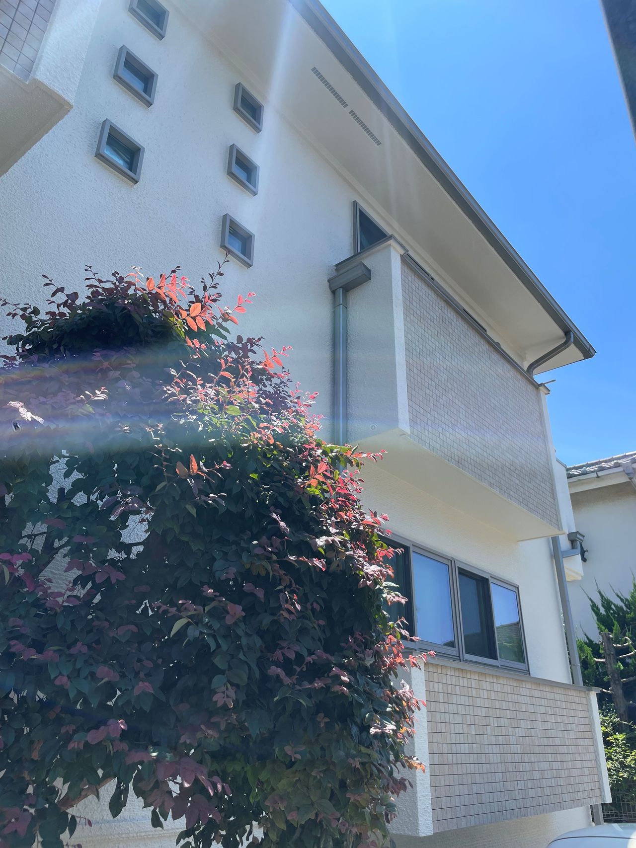 もとの外壁が凹凸のはげしいモルタル素材のため、二種の下塗り材で二度の下塗りをして厚みを出し、塗料の性能を最大限に引き出せるように仕上げました。