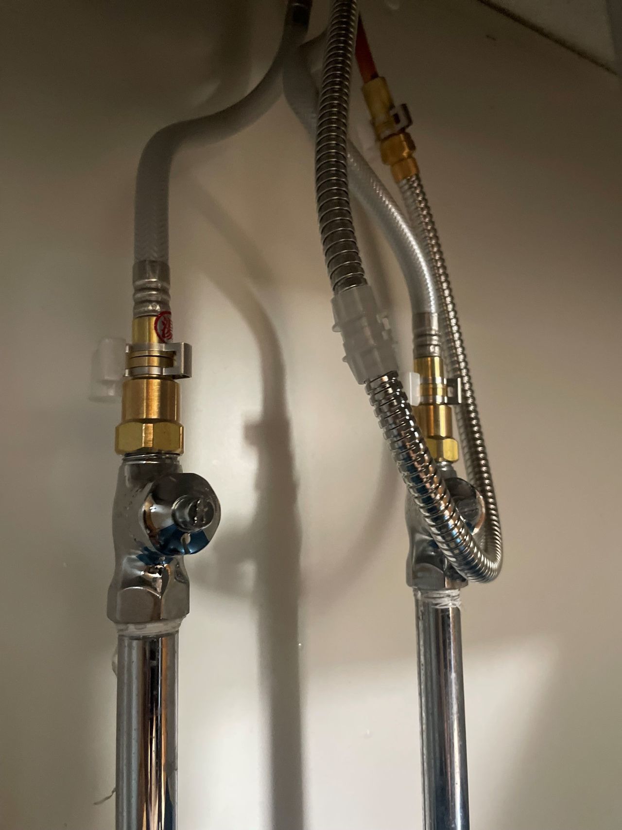 既存の水栓と同等のものをご所望のところ、せっかくなのでシャワー付の水栓をご提案。